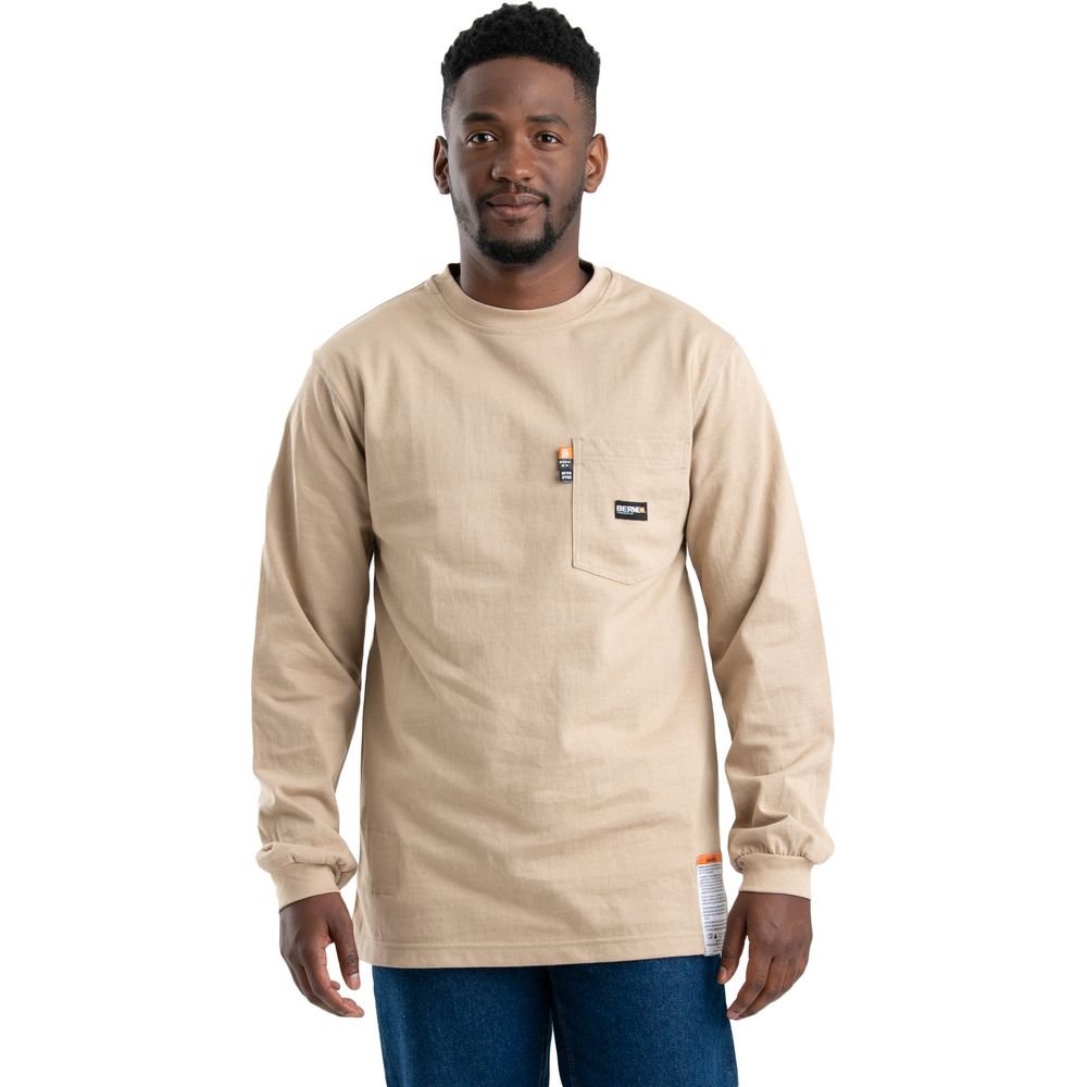 Berne flame-resistant long sleeve t-shirts are made from 7.8 oz. 100%-cotton flame-resistant jersey. They have a front left pocket‚ rib-knit collar and cuffs‚ and side seams that minimize uncomfortable shirt twisting.