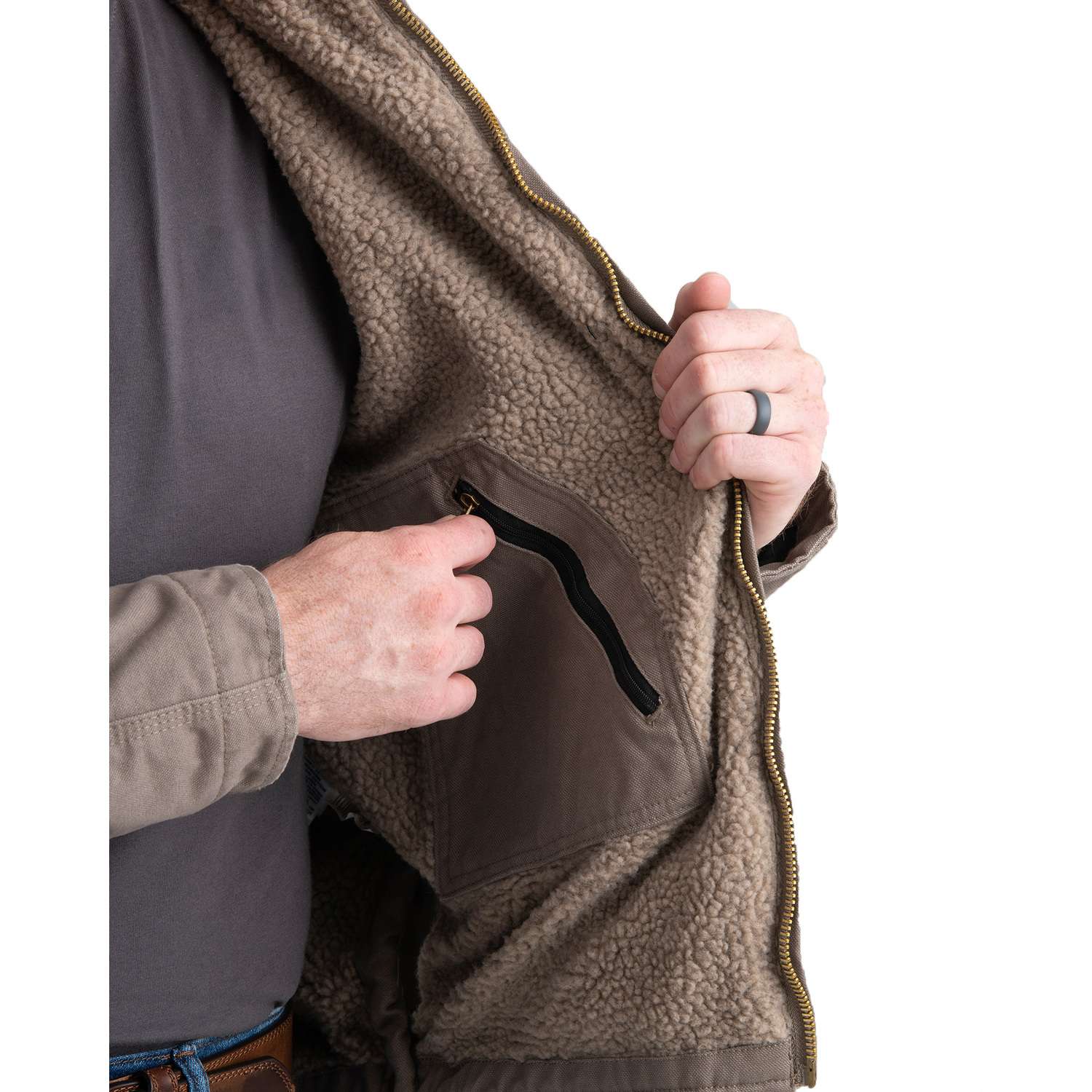 This work jacket is built tough and warm. 12.0 oz. 100% Sanded washed cotton duck with a sherpa lining in the body and a 100% quilted polyester taffeta lining in the sleeves, Features include Pleated bi-swing action back. Heavy duty brass zipper. Extended back for extra warmth keeps you warm on cool, windy days. Hood is sherpa lined