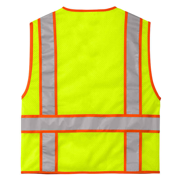 Two-tone contrast fabric under the reflective tape makes this breathable mesh vest stand out on the jobsite.