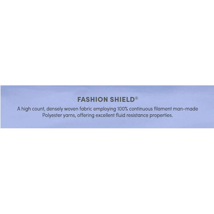• Entire garment constructed of single-ply fluid-resistant barrier fabric of Fashion Shield® a high count, densely woven fabric employing 100% continuous filament man-made polyester yarns, offering excellent fluid resistance properties
