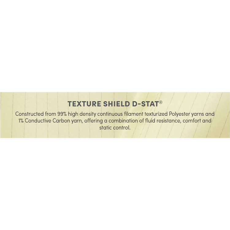 • Constructed from Texture Shield D-Stat® - 99% high density continuous filament texturized polyester yarns and 1% conductive carbon yarn, offering a combination of fluid resistance, wearer comfort, and static control.
