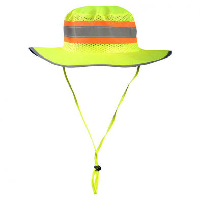 The LUX-RNG by Occunomix is a yellow high visibility ranger hat. Made with 100% polyester mesh, this high visibility ranger hat features a 2" silver reflective tape strip that is back by contrasting fabric.