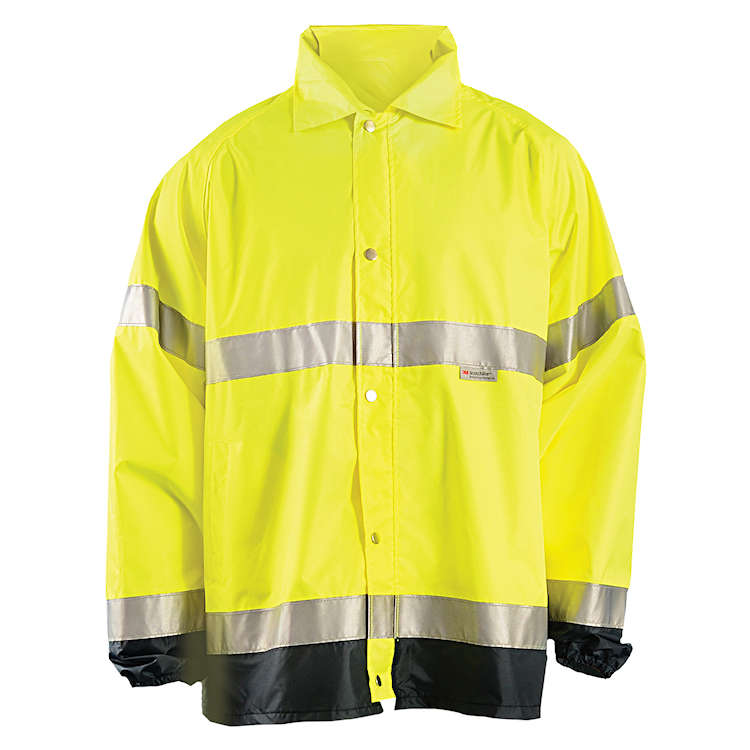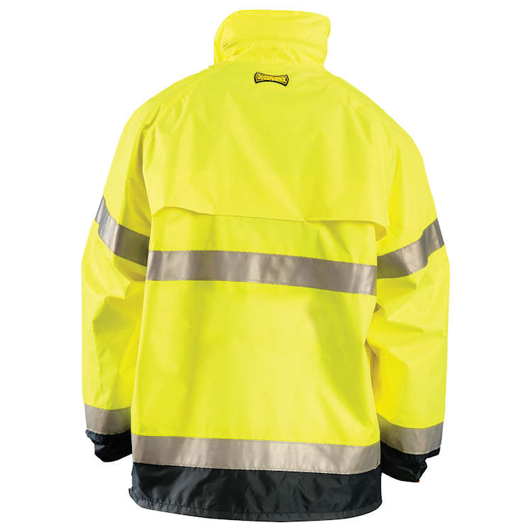 Stay dry and in sight of others with the OccuNomix LUX-TJR breathable rain jacket.