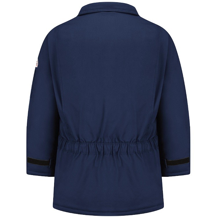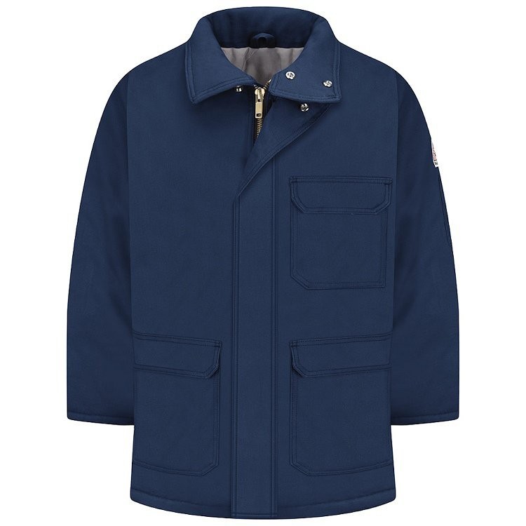 - Two-way separating, heavy duty Nomex® taped brass zipper, fully covered with insulated storm flap, concealed snap closure