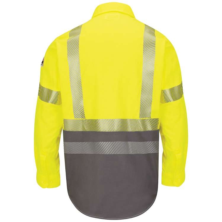 - Color block shirt with hi vis top half and grey bottom half to conceal dirt and stains