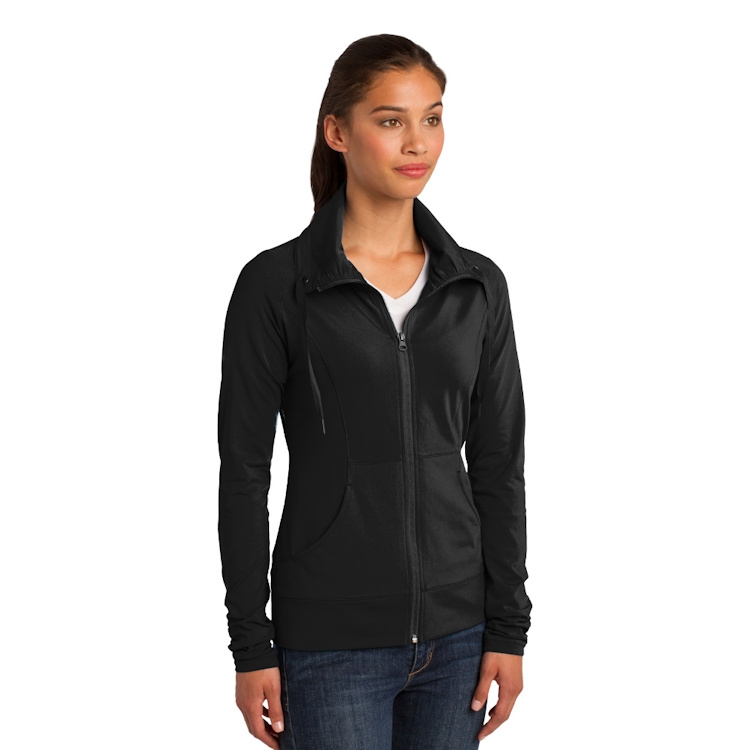 A stretchy, moisture-wicking performance jacket with a soft-brushed backing and unique cowl collar.