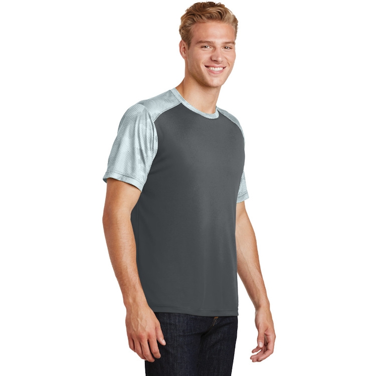 The sublimated digital CamoHex print on the sleeves, shoulders and collar give this moisture-wicking tee a bold, modern look.