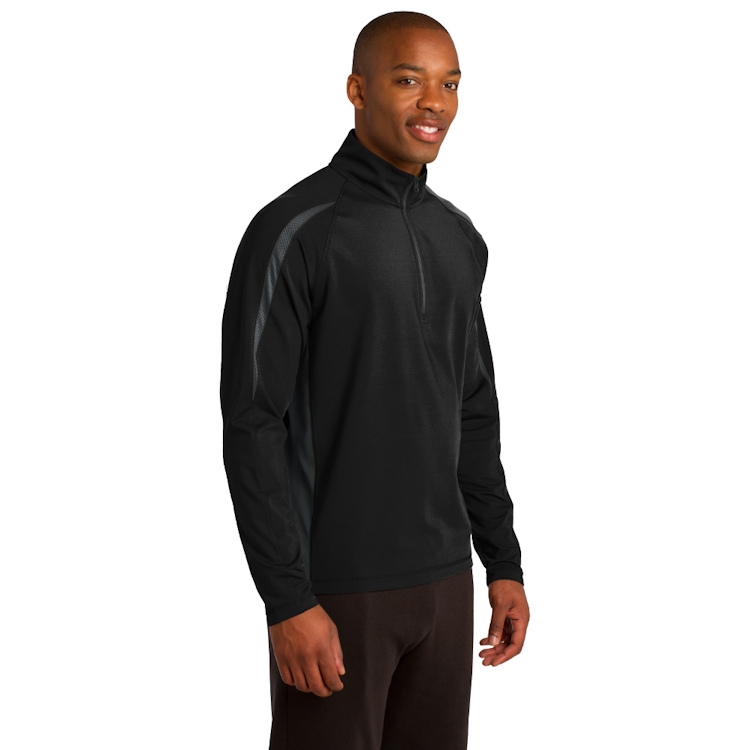 This soft-brushed pullover is stretchy and moisture-wicking with color splices and subtle texture.