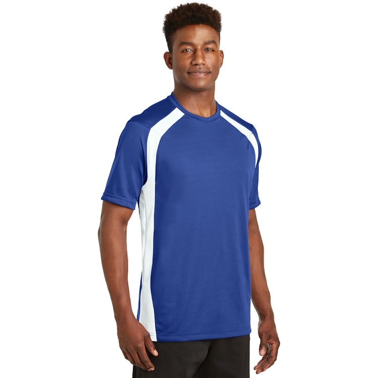 Moisture-wicking, odor-fighting performance with colorblock side panels, raglan sleeves and set-in construction on the back for easy movement.