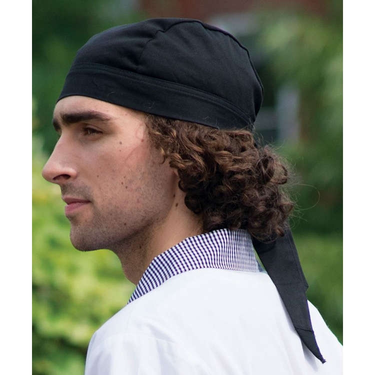 A hip alternative to the conventional chef hat, with elastic back and ties for a more comfortable fit.