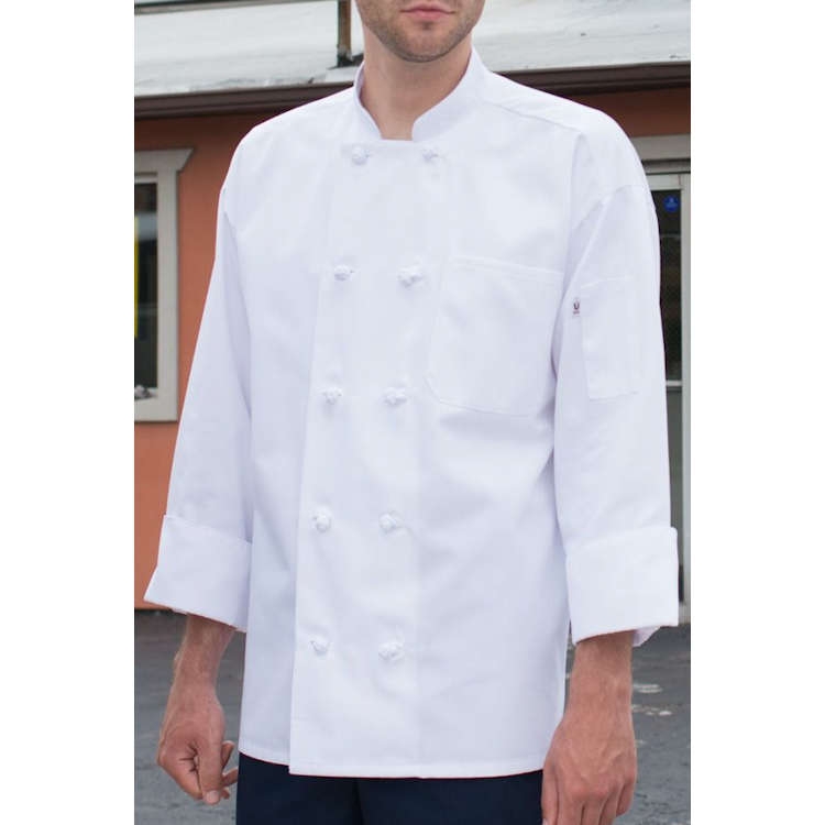 Like carefully lowering your tone arm down and experiencing your favorite rock group on vinyl, this chef coat is a true classic. This artfully constructed coat features ten inset knot buttons that lay smooth and look clean, not just hang there nonsensically.