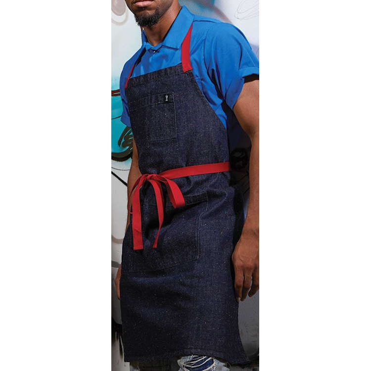 Deep rich denim, red web ties and a selvedge edge is the driving force behind this standout apron. Features bib styling, one three-section pocket, one three-section chest pocket and one specialty side pocket, adjustable neck, reinforced bar tacking and extra-long 43" web ties. Made in the USA.
